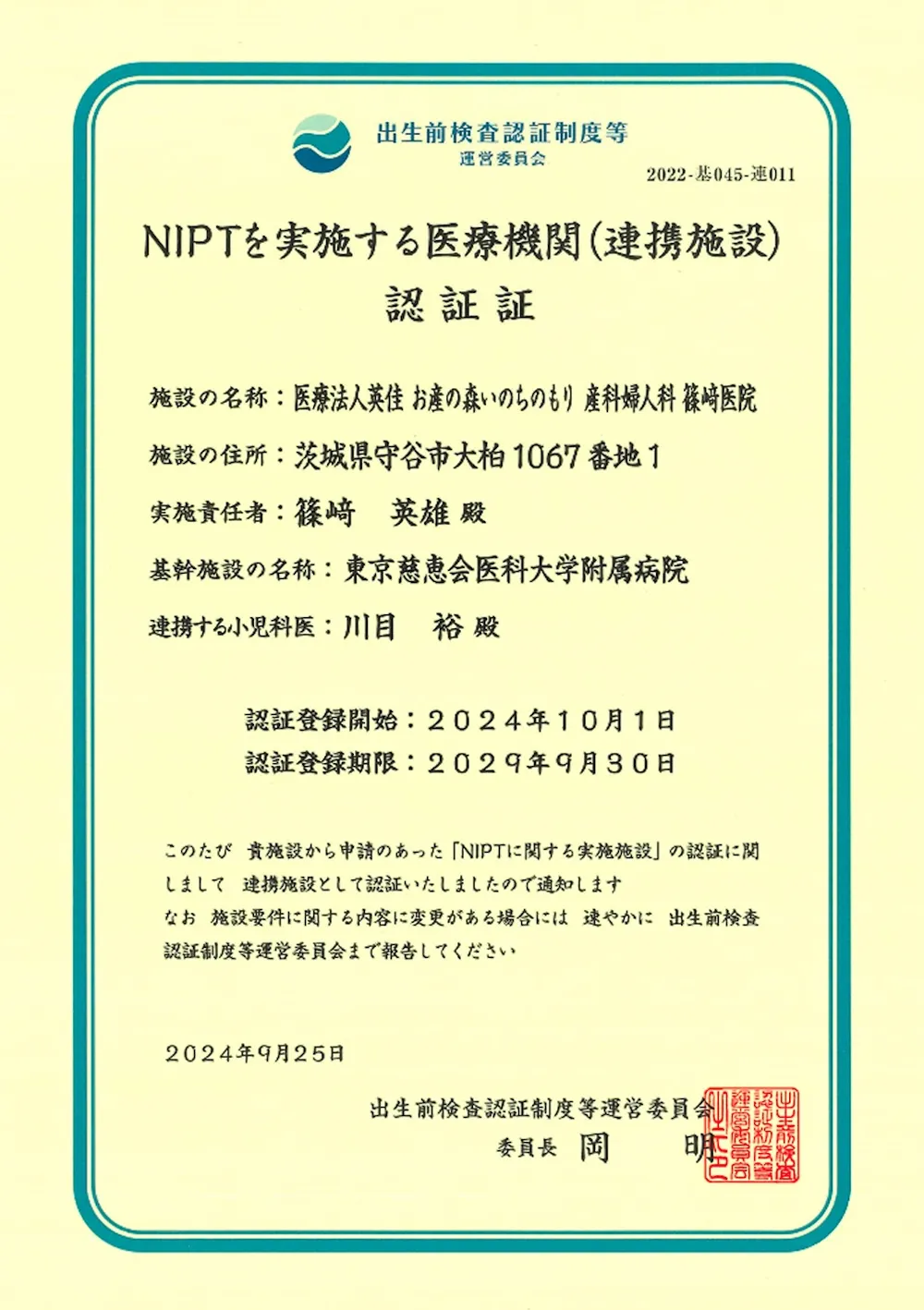 当院は出生前検査認証制度等運営委員会の認証を受け、お母さんの血液を用いた新型出生前検査(NIPT)を2024年10月より開始しております。